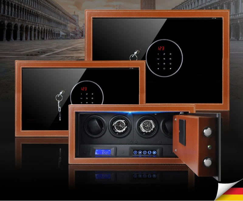 Features a reinforced structure with biometric or key lock system, ultra-quiet Japan motors, and soft velvet-lined cushions. The microfiber leather exterior provides a refined, scratch-resistant finish, while the interior lighting adds a museum-like display effect.