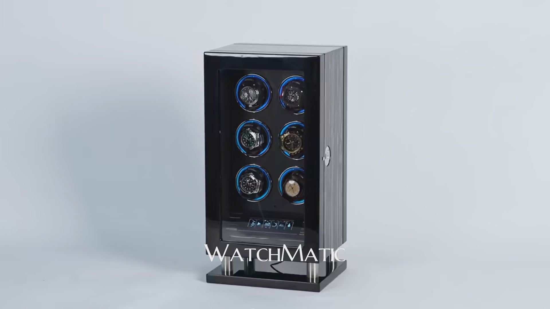 Encased in a luxurious cabinet-style structure, this winder features four individually programmable rotors, a suede-lined interior, LED lighting, and a glass front panel for elegant visibility and dust protection.