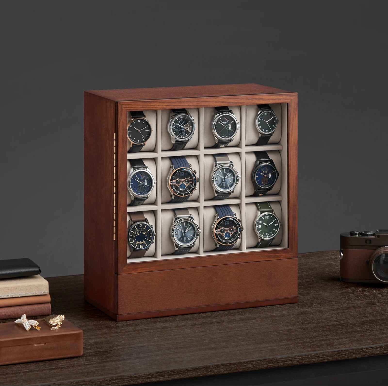 Crafted from smooth-finished wood, this vertical case features 12 padded slots arranged in an upright layout with a front-facing clear glass door. Magnetic closure and soft interior lining offer both protection and ease of access.